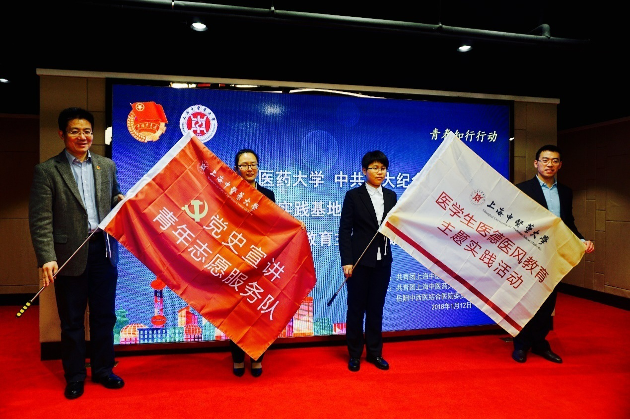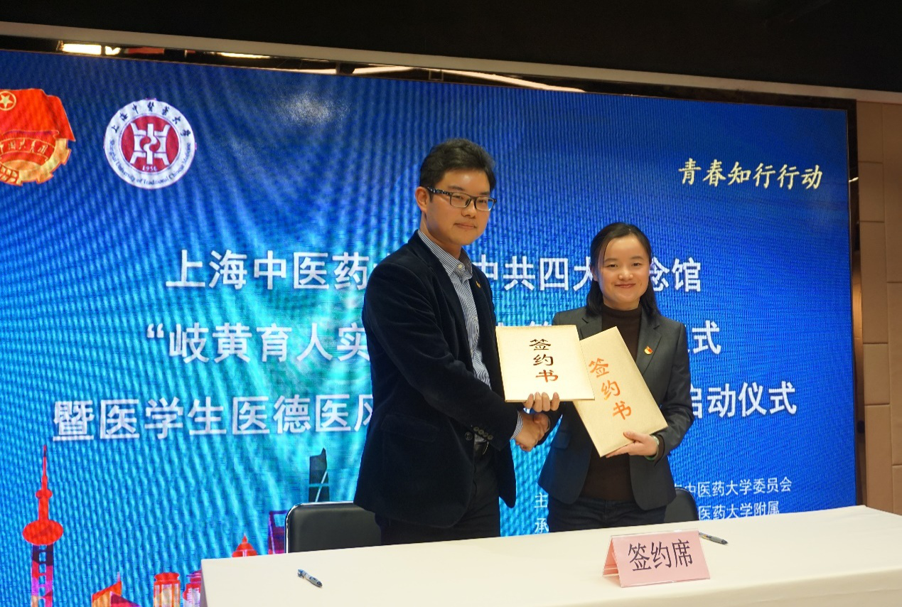 1月12日,我校与中共四大纪念馆“岐黄育人实践基地”签约揭牌仪式暨医学生医德医风教育主题实践活动启动仪式在上海中共四大纪念馆海派文化中心顺利举行。校党委副书记、副校长朱惠蓉,虹口区委宣传部副部长、区文明办主任赵明,校马克思主义学院党总支书记陈秋生,中共四大纪念馆馆长徐明,虹口团区委副书记徐雪琛,校学工部副部长王鑫,校党委组织部组织员千英信,附属岳阳医院党委副书记朱亮,校团委副书记吴平,中共四大纪念馆副馆长邹悦及各附属医院团委书记、各临床医学院学生共60余人参与活动。