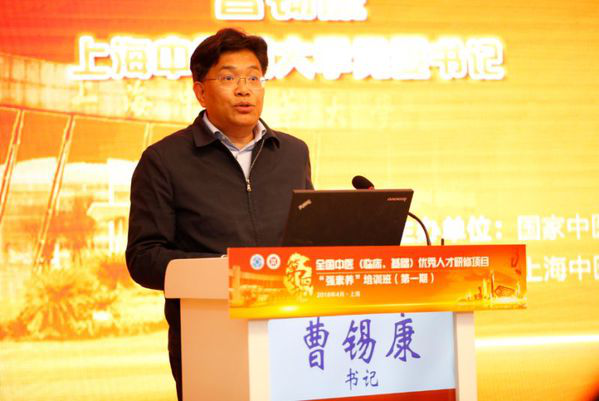 4月9日,第四批全国中医(临床、基础)优秀人才研修项目“强素养”培训班(第一期)开班仪式在我校举行,国家中医药管理局人事教育司司长卢国慧,上海市卫生计生委副主任、市中医药发展办公室主任张怀琼,市中发办中医药传承发展处处长王庆华、副处长姚玮莉,国家中医药管理局人事教育司曾兴水出席开班仪式。我校党委书记曹锡康、副校长胡鸿毅,我校科技人文研究院院长、本次培训班名誉班主任王键和第一期学员班86人参加了开班仪式。会议由胡鸿毅主持。